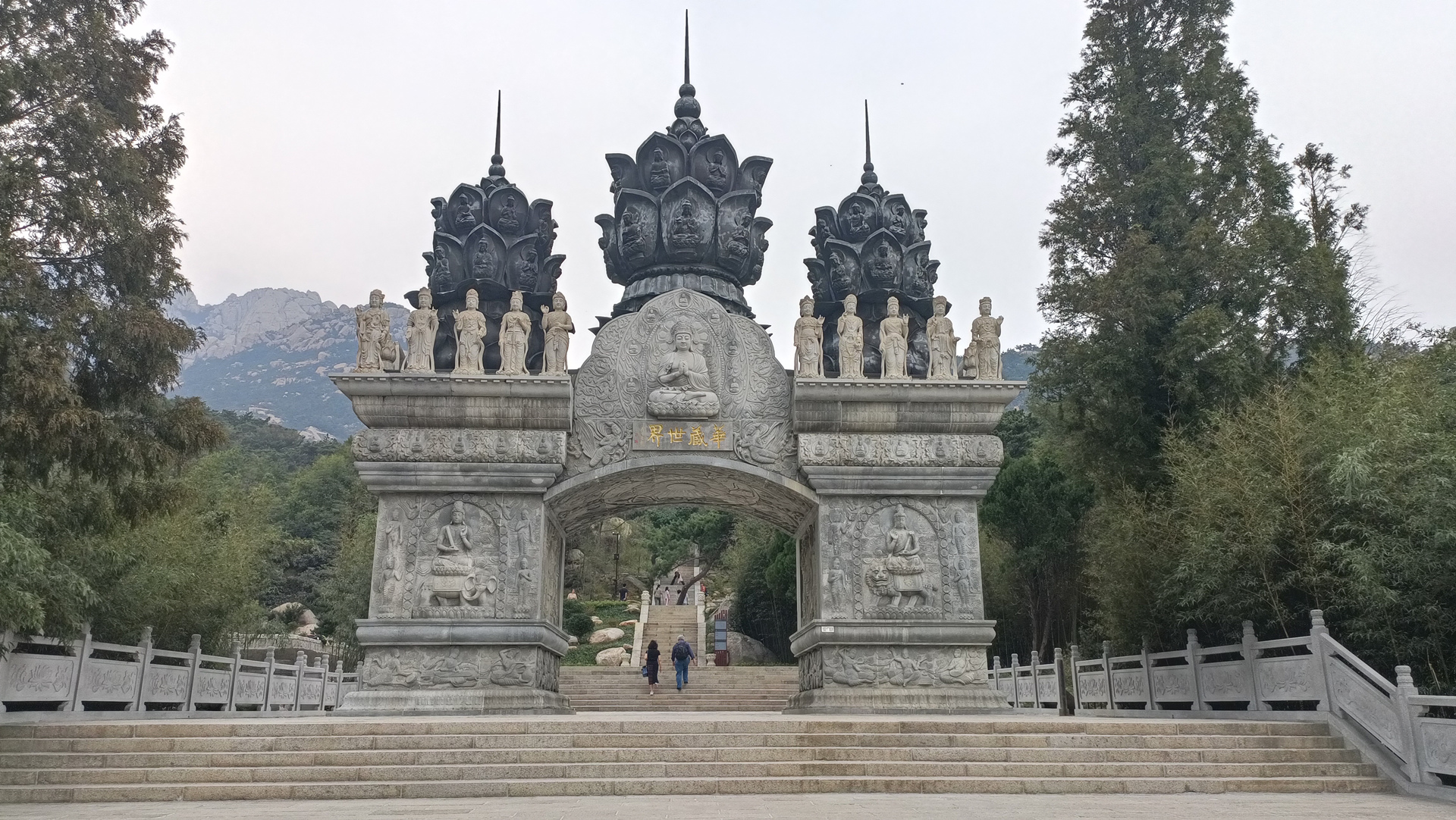 顺着莲花路拾级而上,迎面而来的是华藏世界门,这座气度不凡的山门上雕刻着佛、菩萨、飞天和金刚力士等雕像,神圣壮观。再往上是“迎客松”景点,一座双手合十的小沙弥的雕像对着华藏世界门,中间是一棵造型独特的松树,这就是游览区的“迎客松”,迎客松亦或是迎客僧,禅意十足,旁边是新增加的“听涛”石刻。
