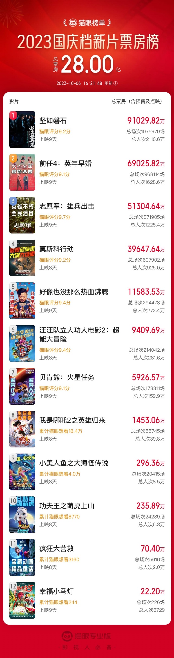 据猫眼专业版数据,截至10月6日16时21分,2023年国庆档新片票房榜(含点映及预售)破28亿,《坚如磐石》《前任4:英年早婚》《志愿军:雄兵出击》分列国庆档新片票房榜前三。