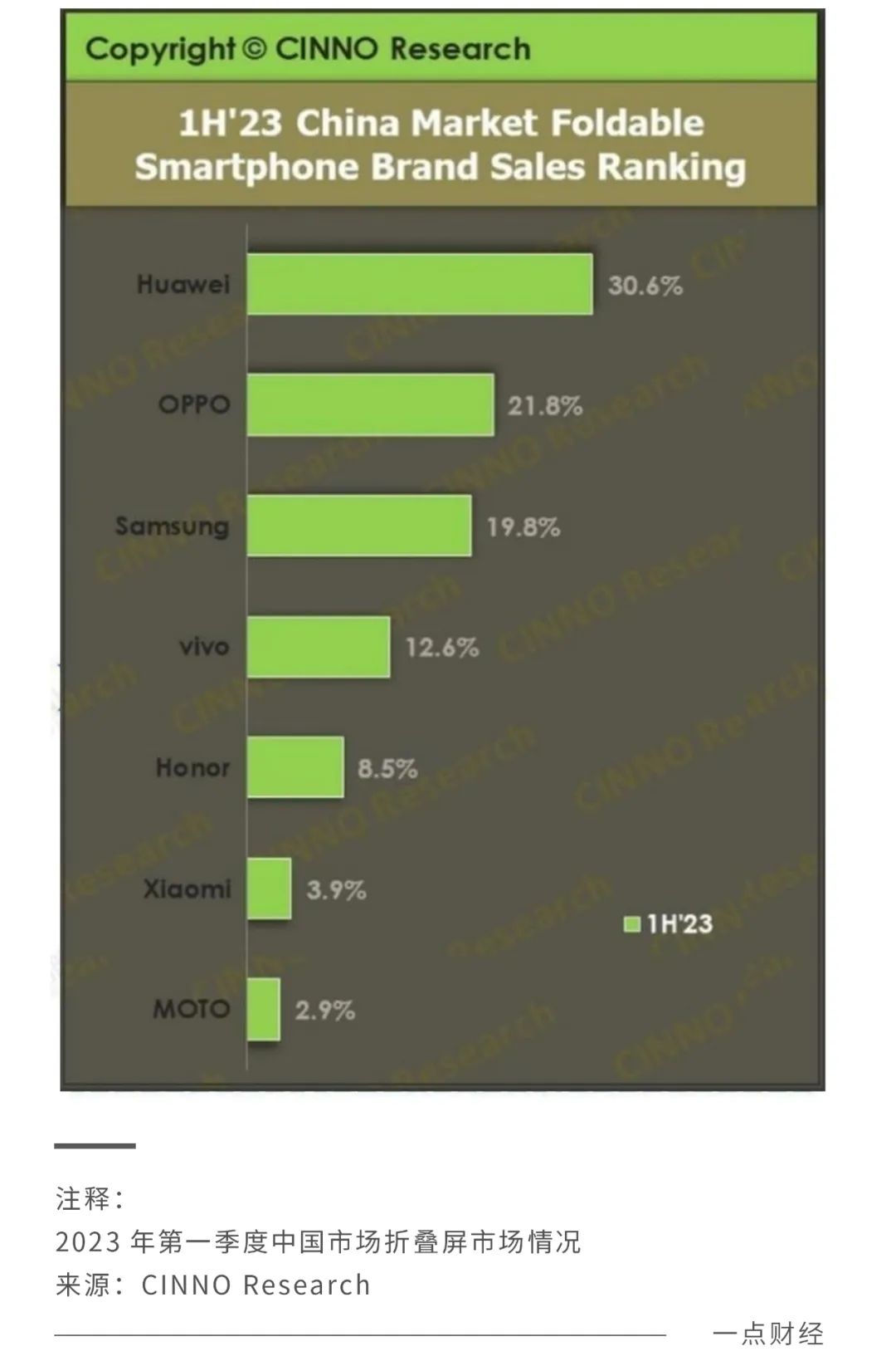 CINNO Research的数据显示,2023年上半年中国市场折叠屏手机销量同比增长了72%,特别是第二季度,实现了近乎百分百的增长,延续了长达十一个季度的火热态势。