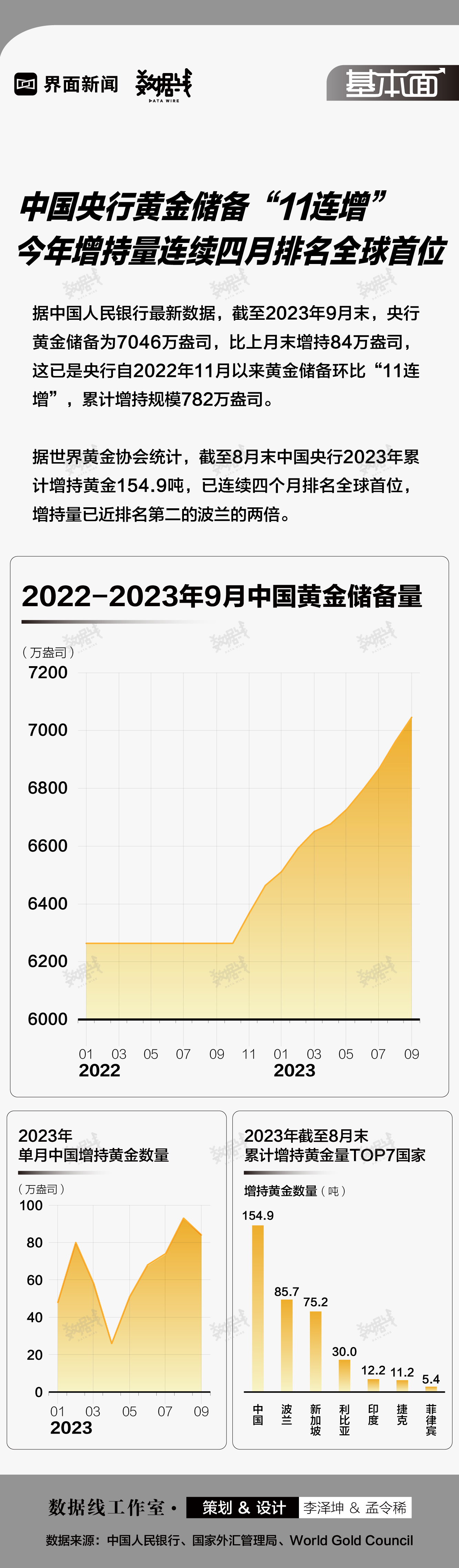 截至2023年9月末,央行黄金储备为7046万盎司,比上月末增持84万盎司。