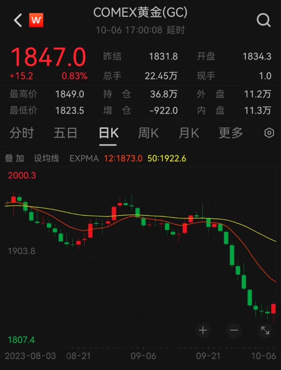 截至10月6日收盘,COMEX黄金即纽约金报收1847美元/盎司(约合人民币475.7元/克),较节前价格下跌约1.84%,较9月高点下跌了约6.7%。9月25日-10月5日,纽约金已连续九个交易日下跌。