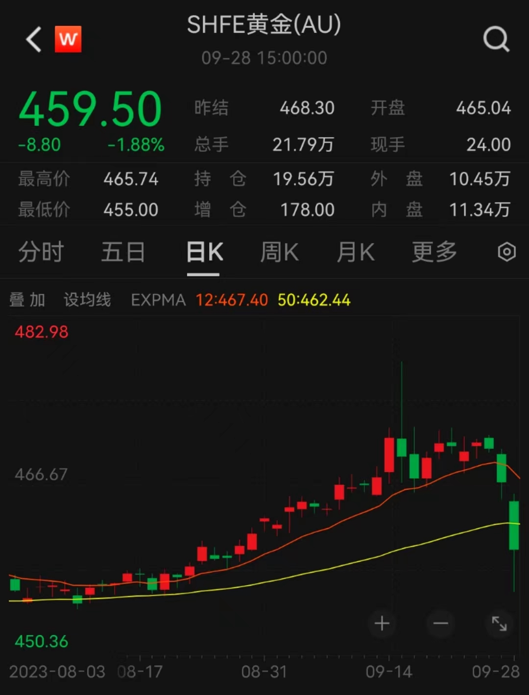 沪金也在节前大幅下跌。截至9月28日,沪金报收459.5元/克,当日下跌1.88%,较9月高点下跌4.32%。