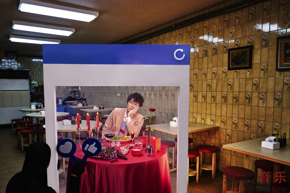 延续专辑概念,以为框里的克群在充满高级餐具及装饰的餐厅用餐,但框外的现实,却是平凡无奇的小吃店;