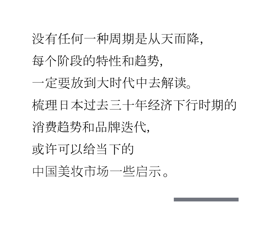 不过鉴于中日相似的经济发展脉络,在“经济下行”这一共同课题下,梳理日本在过去三十年的历史经验,也许能够为进入转型期的美妆行业照一照镜子。