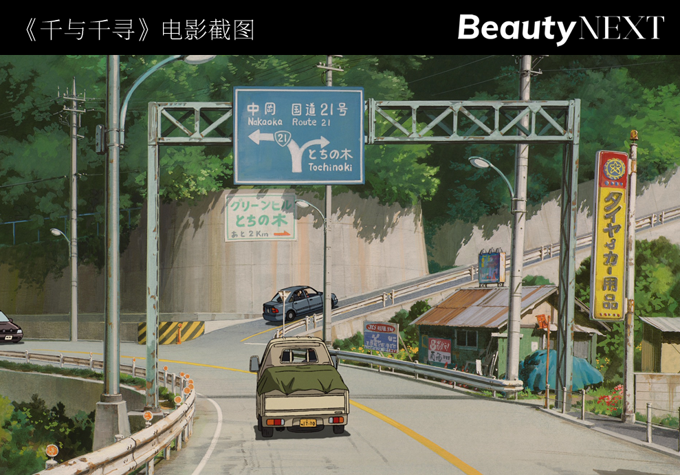 《千与千寻》上映的时间是2001年,在电影一开始,10岁的小女孩千寻和其父母驾着奥迪车前往新家,当从国道20转入国道21时,千寻的父母为了抄近路,让全家迷失在了神灵的浴场街,也引出了后面的故事。