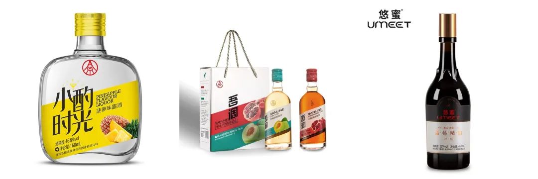从左至右依次为五粮液的小酌时光、吾调系列以及茅台的悠蜜