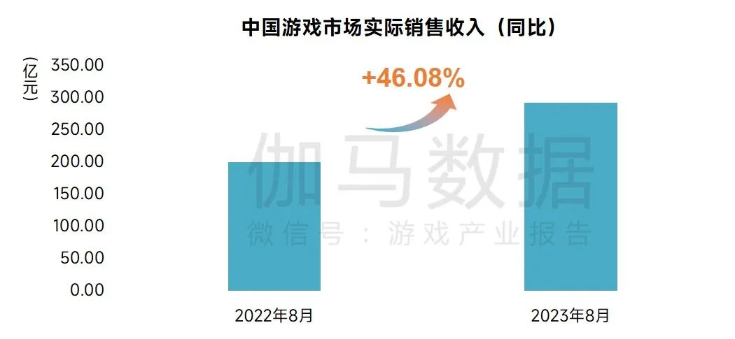 2023年8月,中国游戏市场实际销售收入292.26亿元,环比上升2.15%,同比上升46.08%,同比增长幅度再次扩大。