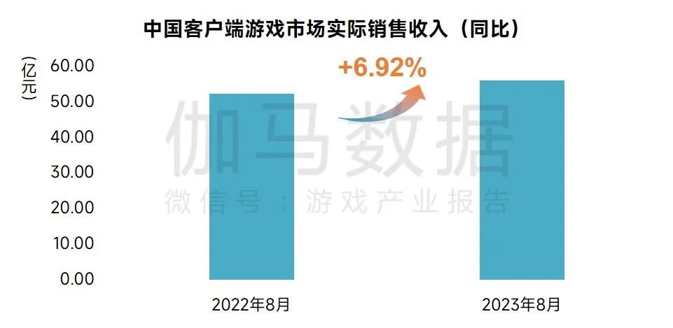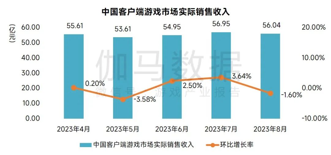 2023年8月,中国客户端游戏市场实际销售收入达56.04亿元,环比下降1.60%,同比增长6.92%,头部产品活动表现不如上月。