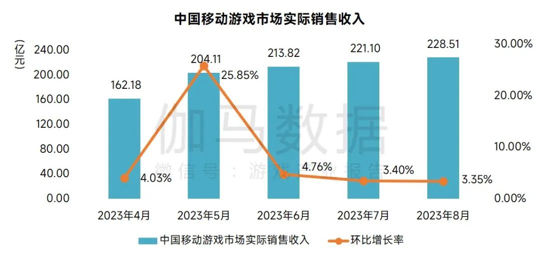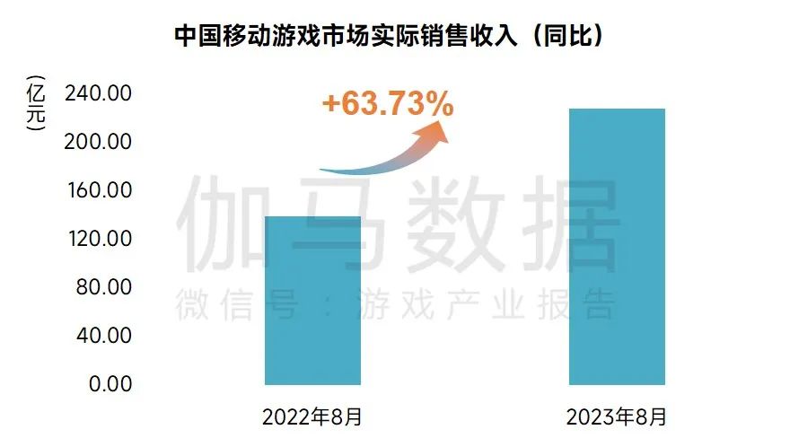 2023年8月,中国移动游戏市场实际销售收入228.51亿元,环比上升3.35%,同比上升63.73%,暑期及七夕节日活动有带动作用。