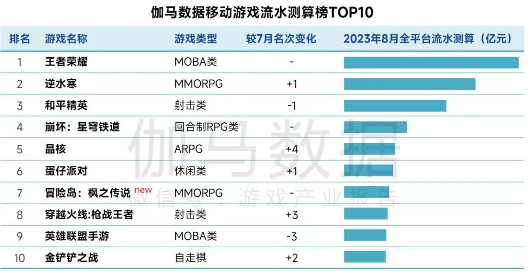 2023年8月,伽马数据移动游戏流水测算榜TOP10中《晶核》排名上升幅度最大,上升4名;新游《冒险岛:枫之传说》入榜,位于第7名。