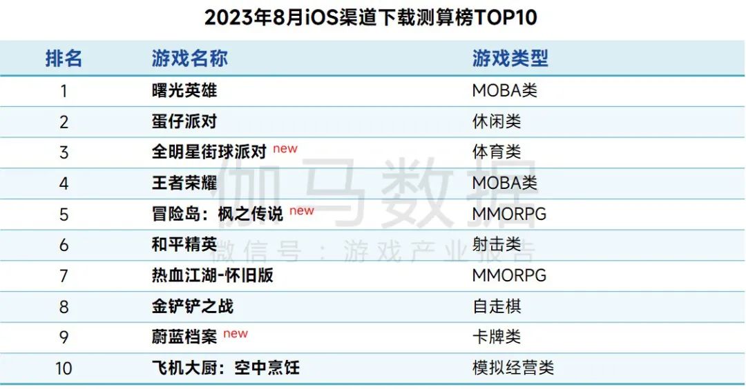 2023年8月iOS渠道下载测算榜TOP10中,《曙光英雄》登上榜首位置,本月3款新游入榜,分别为《全明星街球派对》《冒险岛:枫之传说》《蔚蓝档案》。