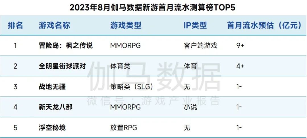 2023年8月,《冒险岛:枫之传说》登顶伽马数据新游首月流水测算榜,首月流水预估超9亿元;另外,5款产品中有3款是IP改编产品,涉及IP类型包含客户端游戏、体育以及小说。