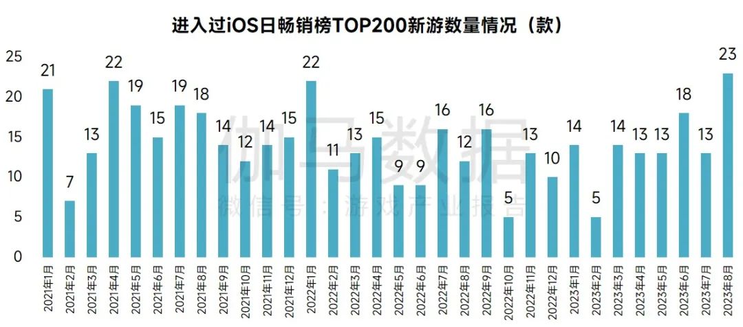 2023年8月,进入过iOS日畅销榜TOP200的新游数量为23款,为2021年至今入榜产品数量最多的月份,这表明企业在本年暑期档时间的产品投放意愿较大。