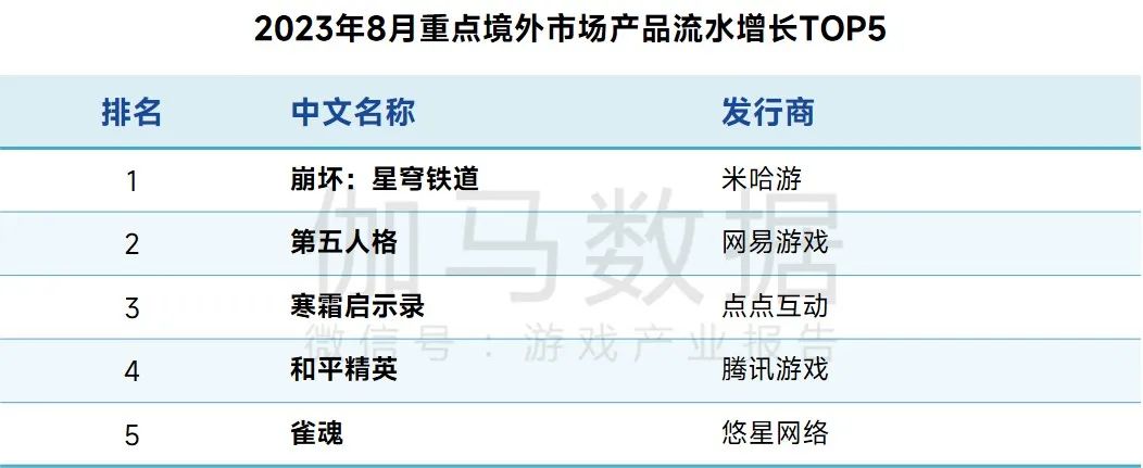 2023年8月重点境外市场产品流水增长TOP5均来自不同游戏企业,2款游戏专注海外发行。