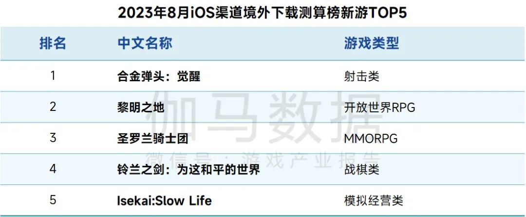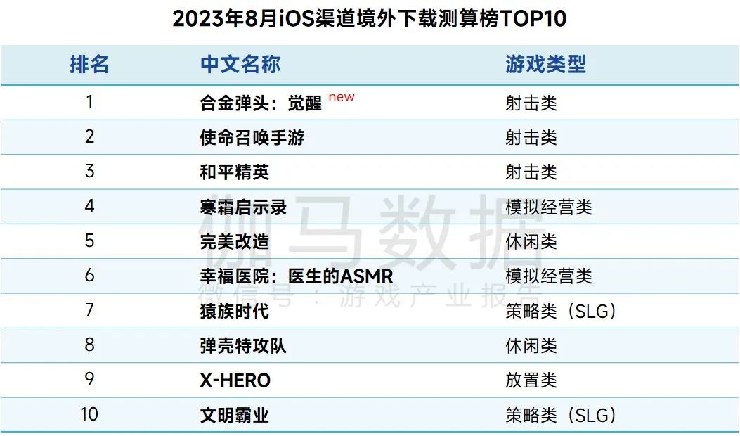 2023年8月iOS渠道境外下载测算榜TOP10中,新游《合金弹头:觉醒》登顶,榜单中TOP3均为射击类游戏。