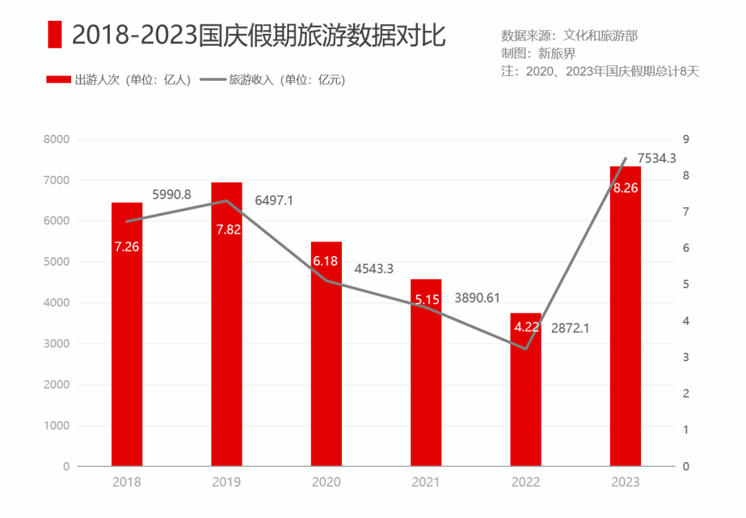 据文化和旅游部数据中心测算,中秋、国庆假期8天,国内旅游出游人数8.26亿人次,按可比口径同比增长71.3%,按可比口径较2019年增长4.1%;实现国内旅游收入7534.3亿元,按可比口径同比增长129.5%,按可比口径较2019年增长1.5%。这一数据创造了有监测记录以来历史上最高的旅游热度。