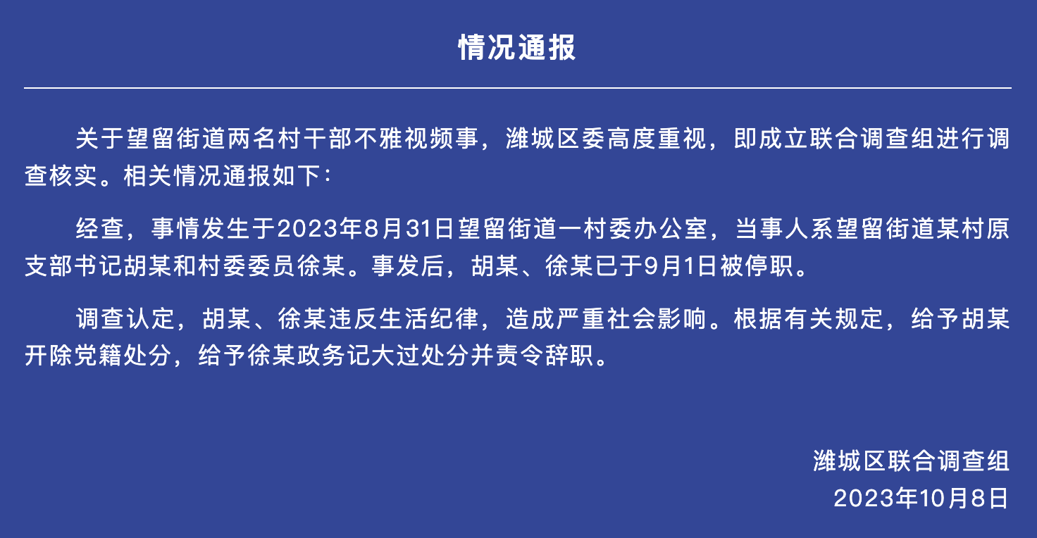 据“潍城发布”微信公众号,10月8日,山东潍坊市潍城区联合调查组发布情况通报。通报称,关于望留街道两名村干部不雅视频事,潍城区委高度重视,即成立联合调查组进行调查核实。