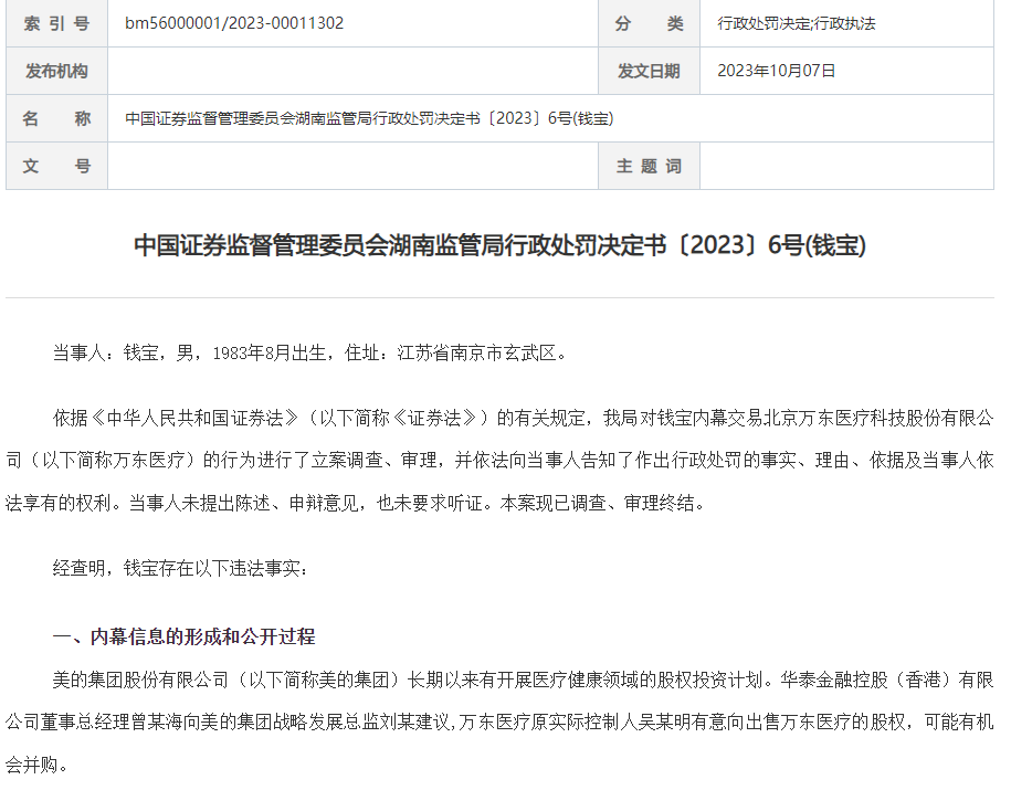 2年前,美的集团(000333.SZ)斥资23亿并购万东医疗(600055.SH),公告前股价飙涨,引发内幕交易质疑,如今被湖南证监局一纸《行政处罚决定书》实锤了。江苏省南京市的““80后”散户钱宝被认定存在内幕交易,依据《证券法》决定:没收钱宝违法所得41.62万元,并处以50万元罚款。