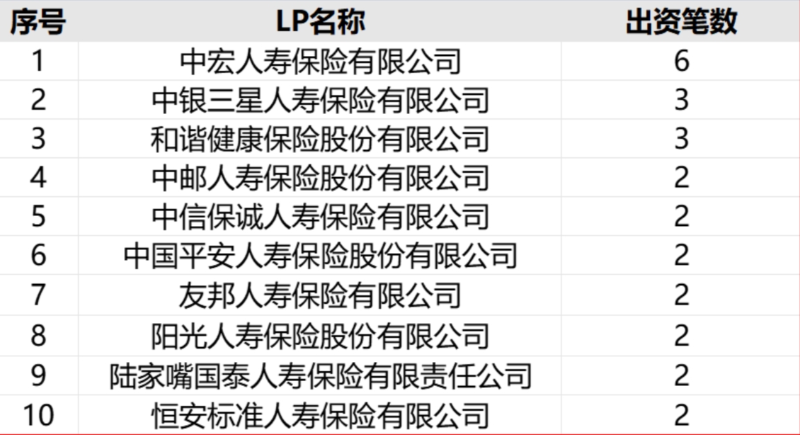 活跃险资LP方面,排名TOP10的险资机构均出资2笔及以上。其中,中宏人寿、中银三星人寿、和谐健康的出资笔数分别为6笔、3笔和3笔。