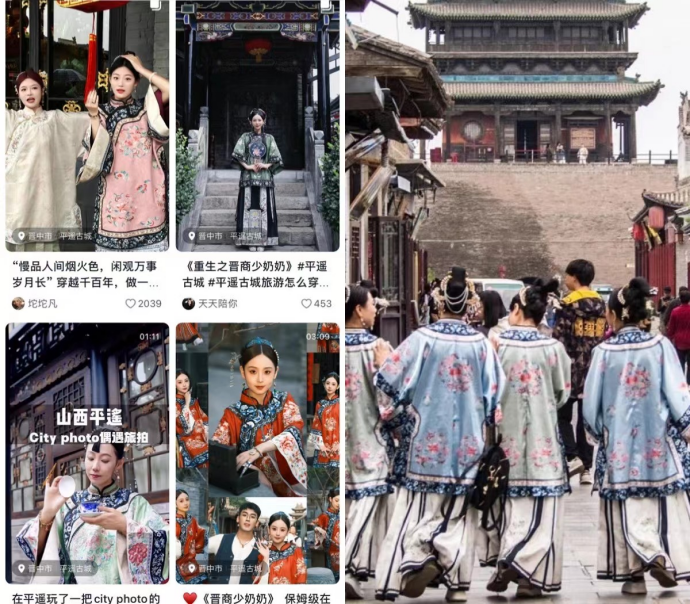 没有大范围少数民族聚集的山西太原是个“特例”,本身无标志性的少数民族服饰,另辟蹊径把自带明清历史滤镜的“平遥古城”和“清汉女”(清朝时期汉族女子穿的服饰)服饰相结合,直接打出了“要拍地处高墙深院的少奶奶,就要在平遥古城”的用户差异化认知。
