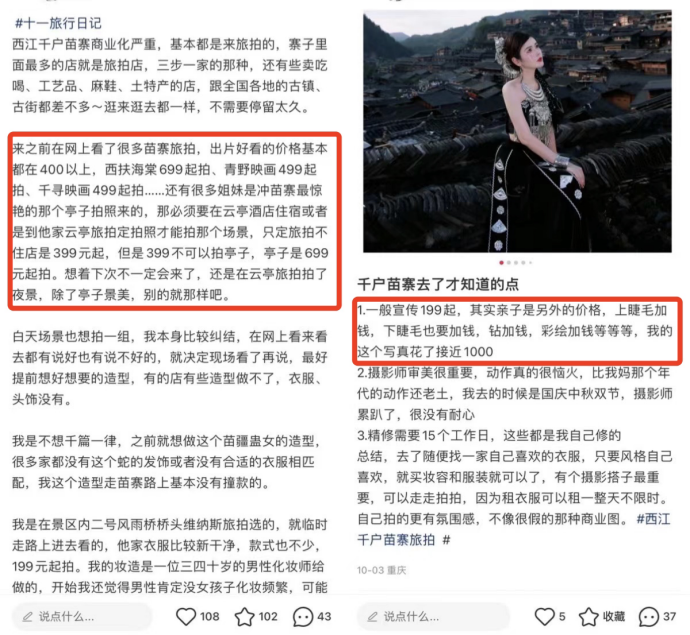 “十一期间去千户苗寨拍苗族少女,价格已经飙到400元,妆造排大队,很多姐妹都是冲着苗寨的网红亭子拍照的,但必须要在云亭酒店住宿或者定制旅拍才能拍那个场景,699元起拍,”有旅客在小红书吐槽,寨子里都是旅拍店,三步一家,但其实拍摄效果跟全国各地的古镇古街都大差不差。