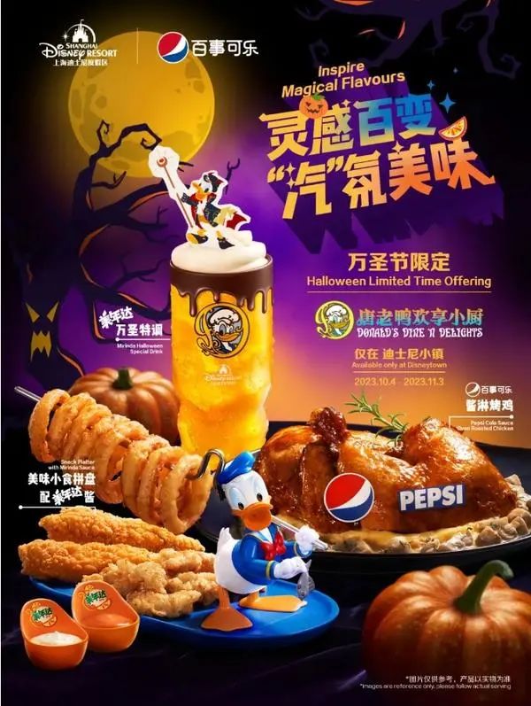 近日,百事可乐、美年达将与上海迪士尼,携手推出万圣节限定“唐老鸭欢享小厨”。该套餐包含百事可乐酱淋烤鸡、美年达万圣特调、小食拼盘配美年达酱等。截止到11月3日,新品将在迪士尼小镇上线。(品牌官方)