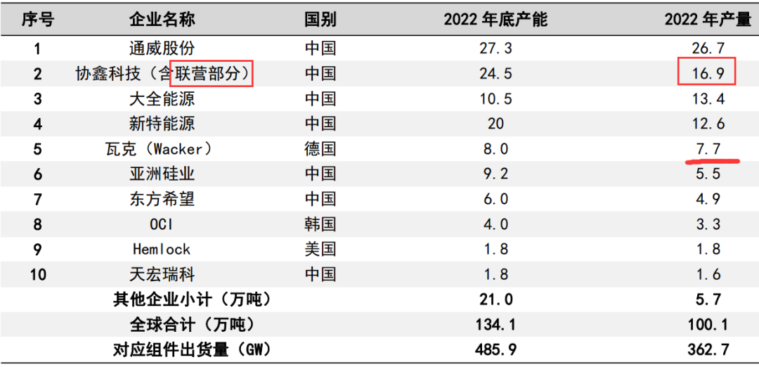 根据协鑫科技2022年年报,新疆戈恩斯实现产量6.4501万吨,位列全国第五、世界第六,排在通威(26.7万吨)、大全(13.4万吨)、新特(12.6万吨)、协鑫科技(10.4万吨,不含联营部分)之后,但高于5.5万吨年产量的亚洲硅业和4.9万吨年产量的东方希望。