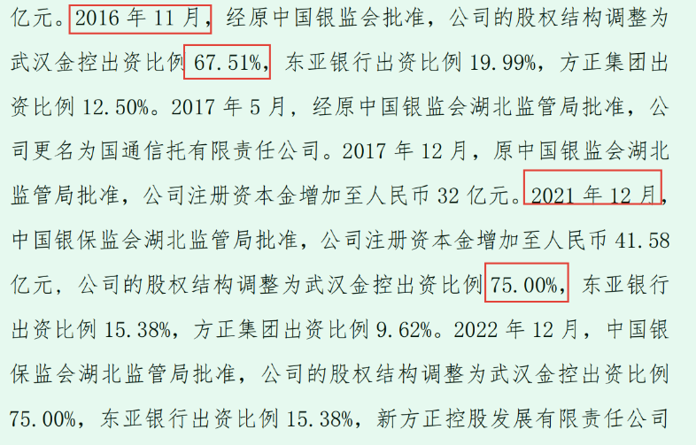 国通信托2022年年报显示,武汉金控出资比例75.00%,东亚银行出资比例 15.38%,新方正控股发展有限责任公司出资比例9.62%。
