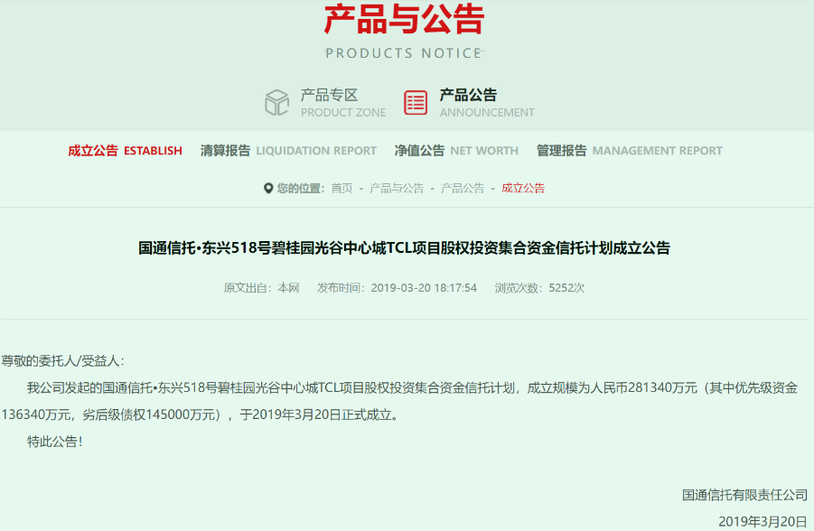 从项目名称看,应是碧桂园与TCL联合开发了一个光谷中心城的地产项目——大概率是今天的TCL科技产业园,国通信托为其设立了一个28亿的集合奖金信托计划。