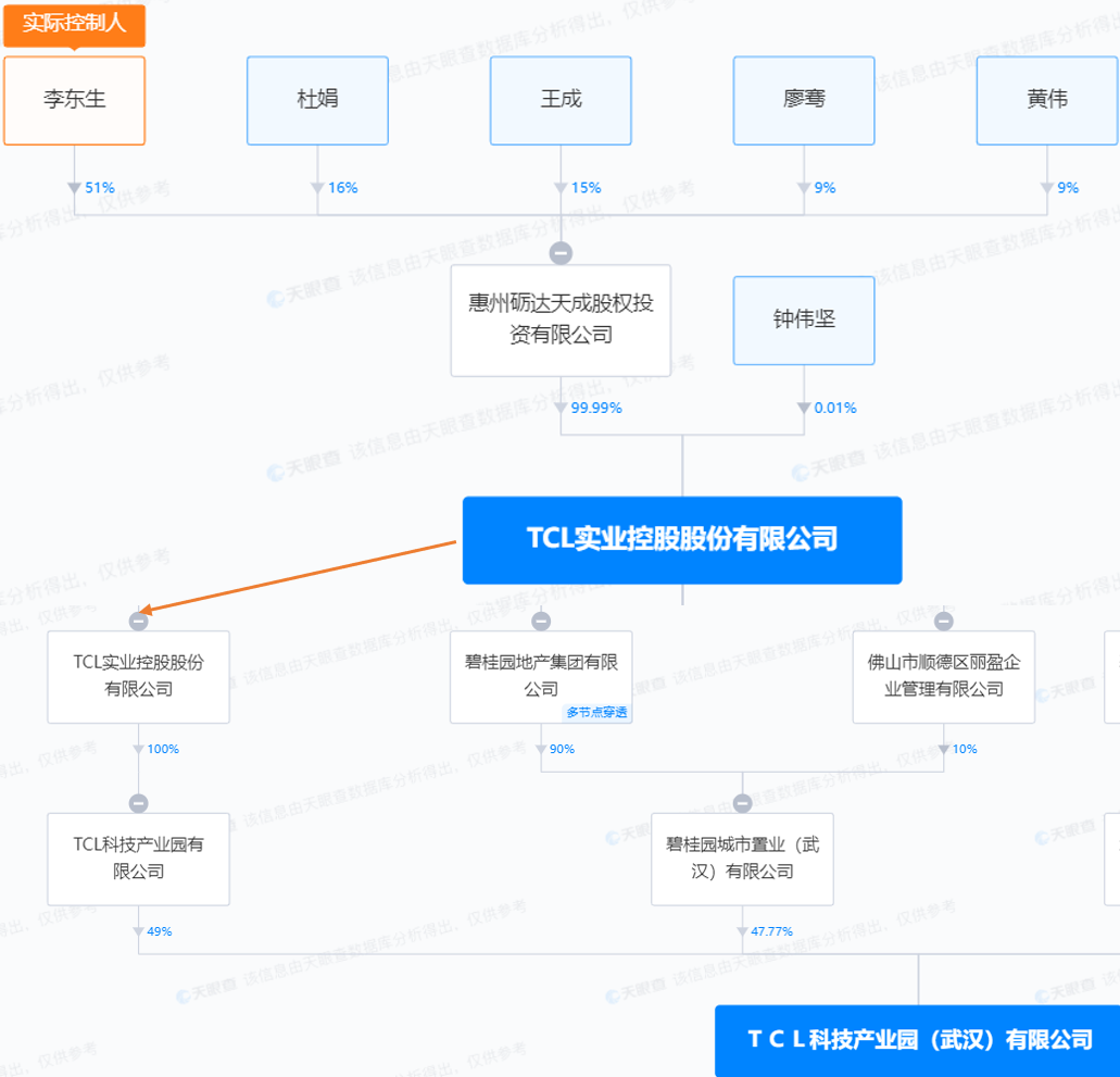 另外,值得一提的是,持有该项目49%股权的TCL实业并非上市公司TCL科技。TCL实业由以李东生为主的TCL的核心高管控股。穿透下来,李东生个人在TCL武汉科技产业园项目中持股接近25%。