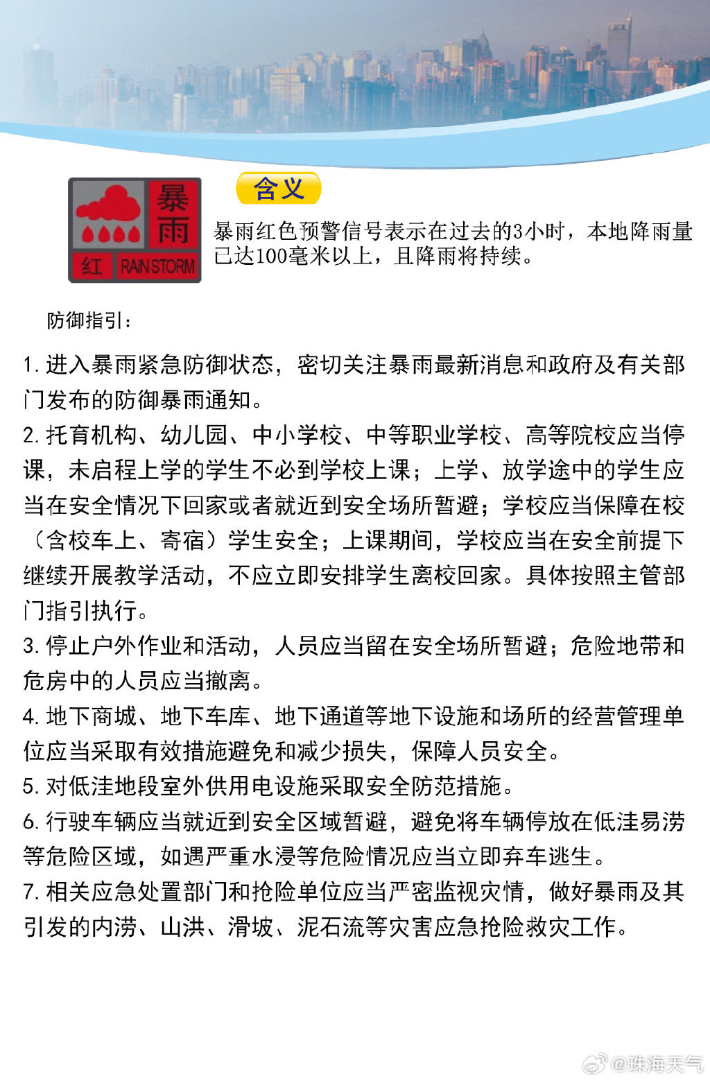 珠海市气象台10月9日9时20分将香洲区、斗门区及高新区暴雨预警信号升级为红色,横琴粤澳深度合作区、金湾区、万山片区及鹤洲洪保十片区暴雨红色预警信号和全市台风黄色预警信号继续生效。根据《珠海市学校(幼儿园)应对台风暴雨极端天气停课安排指引》,今天下午珠海学校停课。