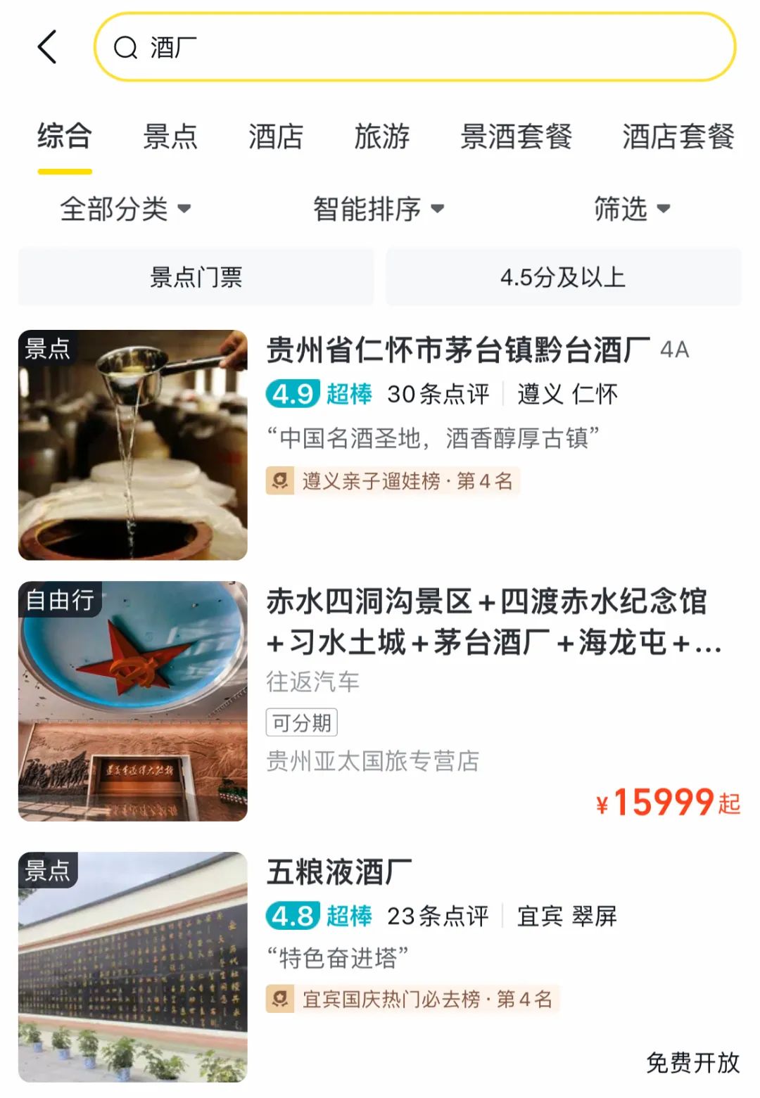 此外,酒讯登录飞猪平台,搜索“酒厂”“酒厂游”等关键词发现,包括茅台镇、赤水河、茅台酒厂、五粮液酒厂等旅游套餐项目总评价均在4.8分以上。其中,五粮液酒厂游成为宜宾国庆热门必去榜第四名。