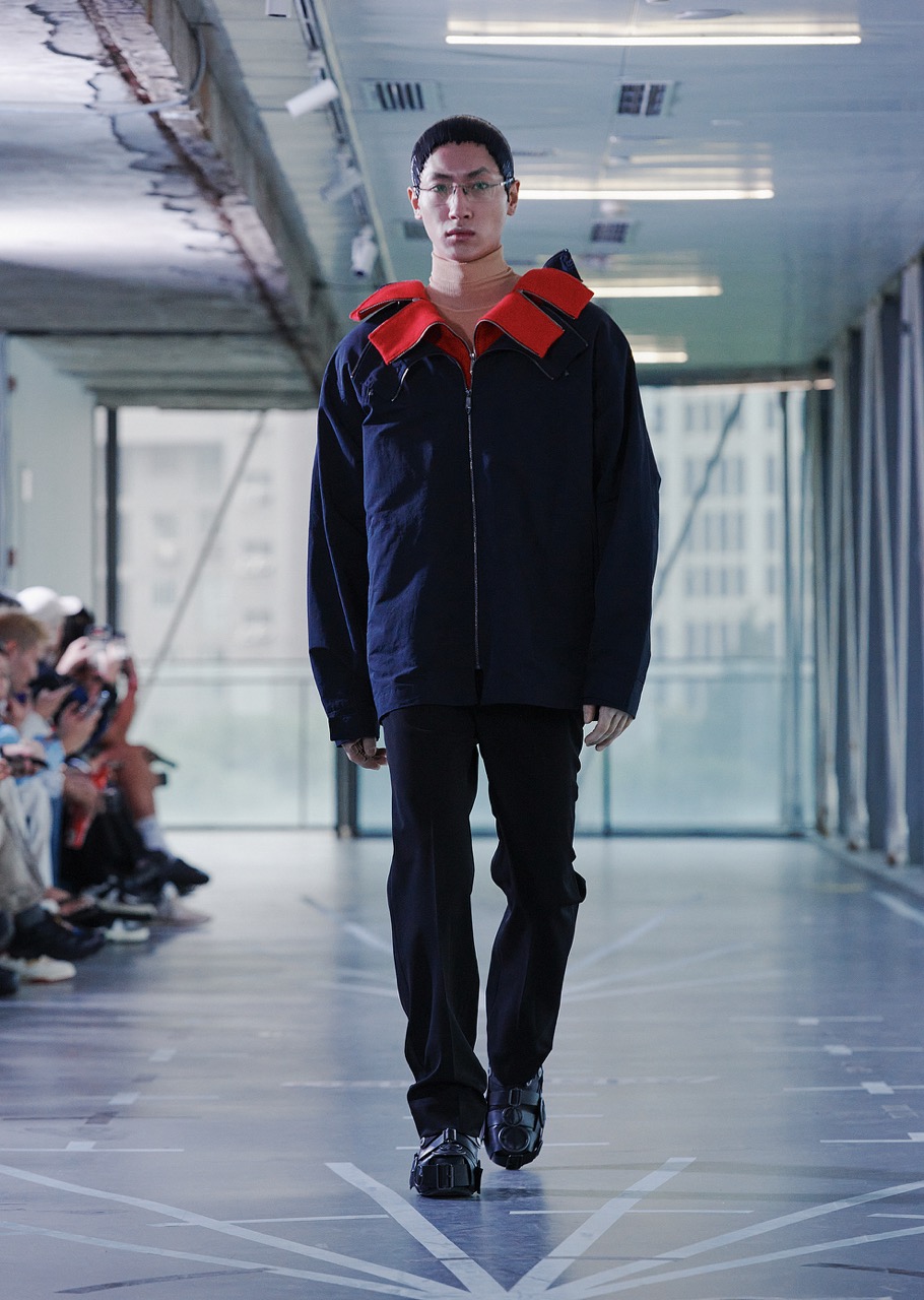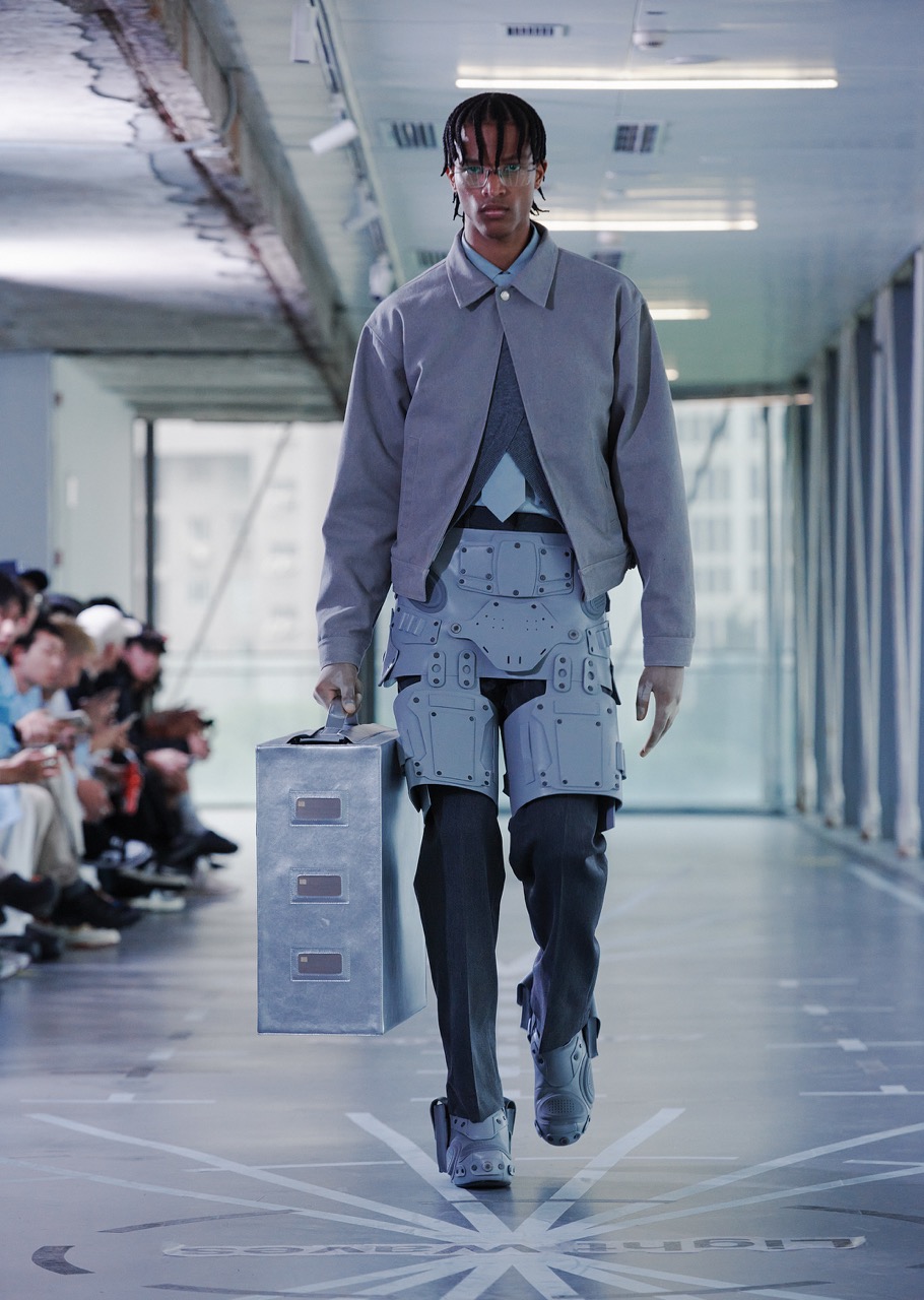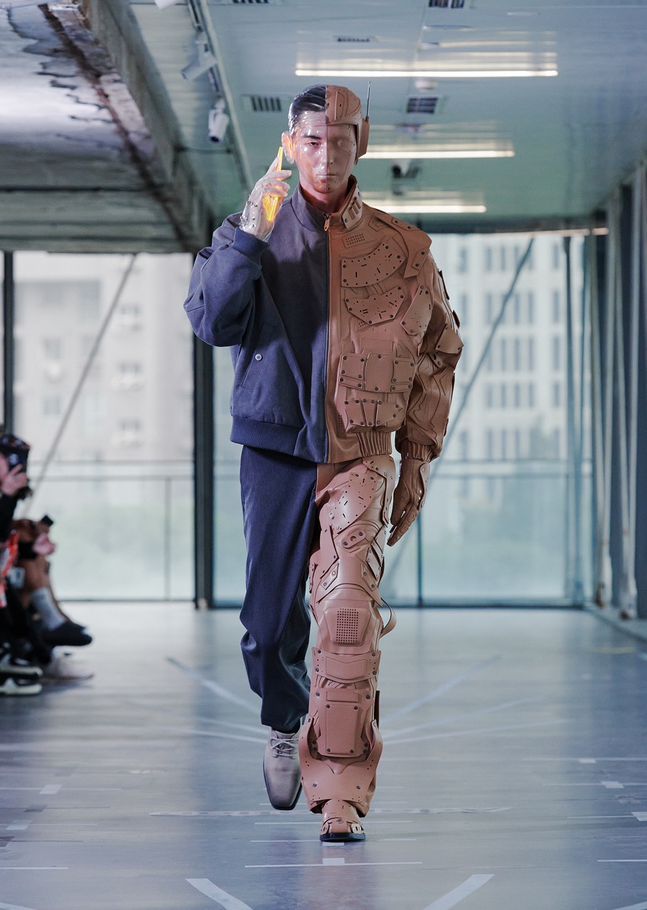 面对多变的气候,设计师通过厚薄和长度不同的单品,营造出混杂、极端的服饰语言。从头盔到TPU鞋靴,服装打造出一个保护性的“第二皮肤”。与此同时,透明和层次感强调视觉交流,喻示人机关系日益亲密,身份认同也在变化。
