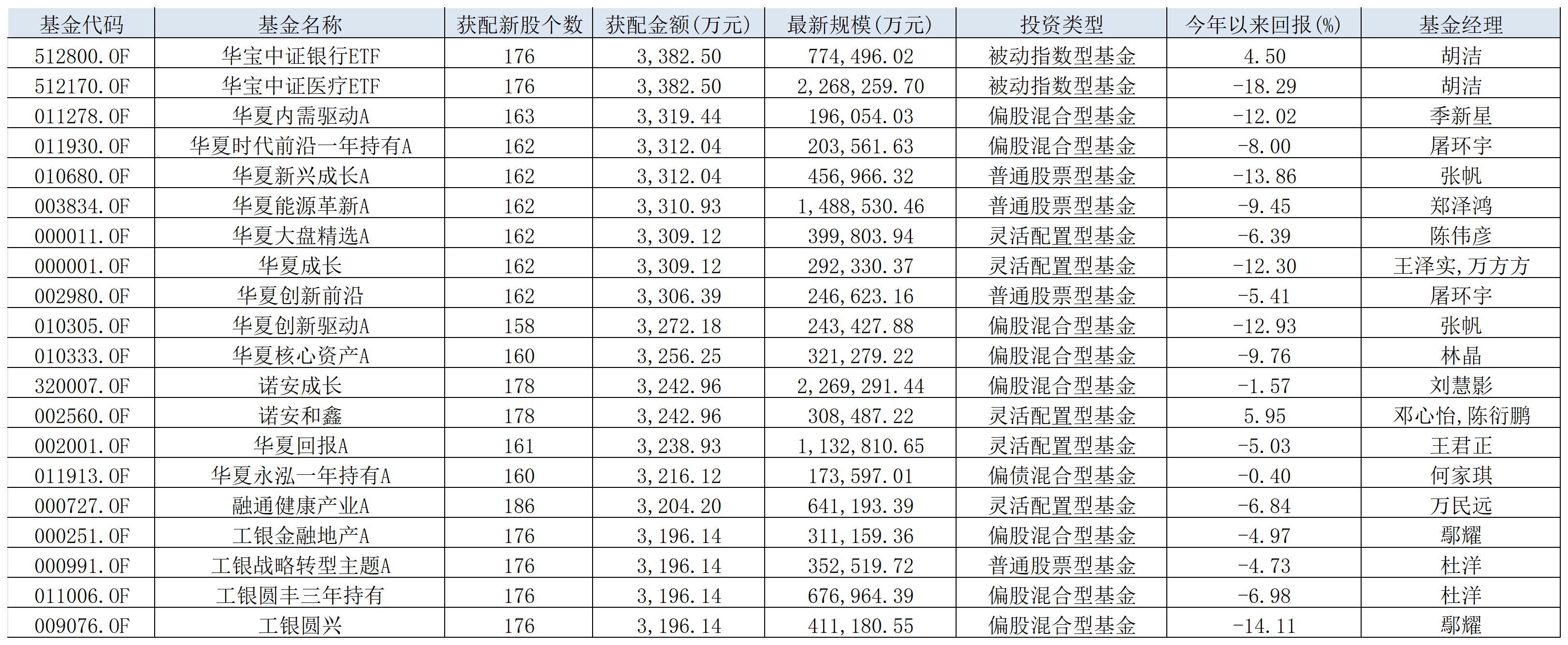 整体而言上述基金今年收益较为一般,获配金额排名前20位的基金中,仅有华宝中证银行ETF、诺安和鑫今年以来回报率为正,其余均为负数。