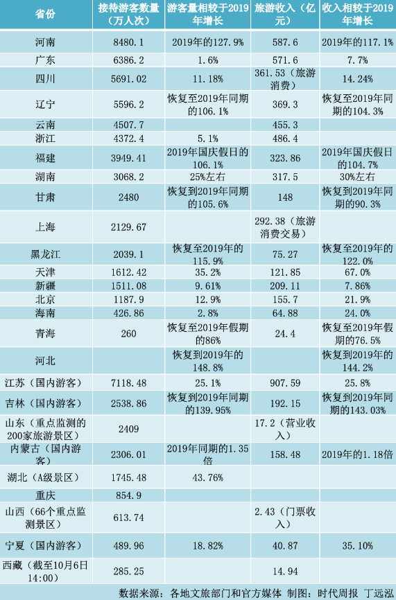 据时代周报记者不完全统计,截至10月8日晚间发稿时,共有26个省市自治区公布中秋国庆假期的文旅数据,并与2019年同期数据进行比较(部分地区数据欠缺)。