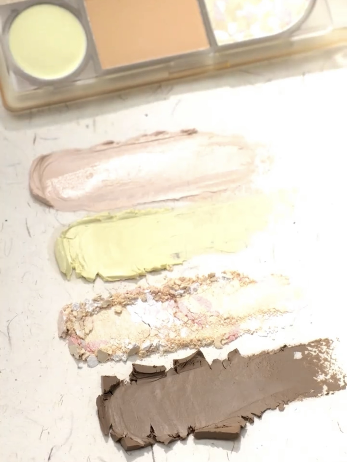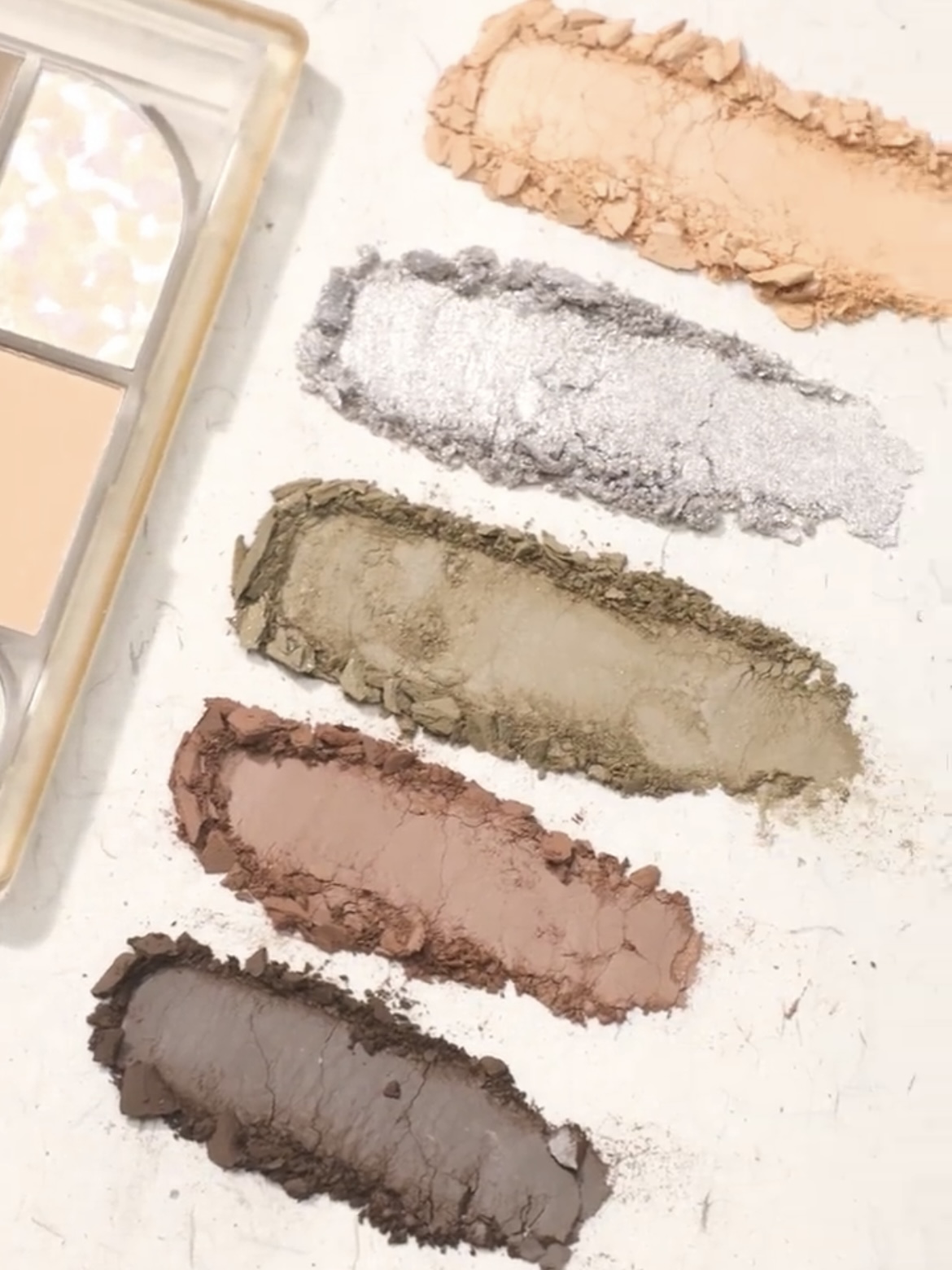 轻氧山野十色盘为粉膏结合质地,包含光感定妆粉饼、裸杏腮红、生姜高光、咖绿色眼影、落叶棕色眼影、深咖眼线、面中提亮膏、妆前打底膏、混色定妆粉饼、修容膏。