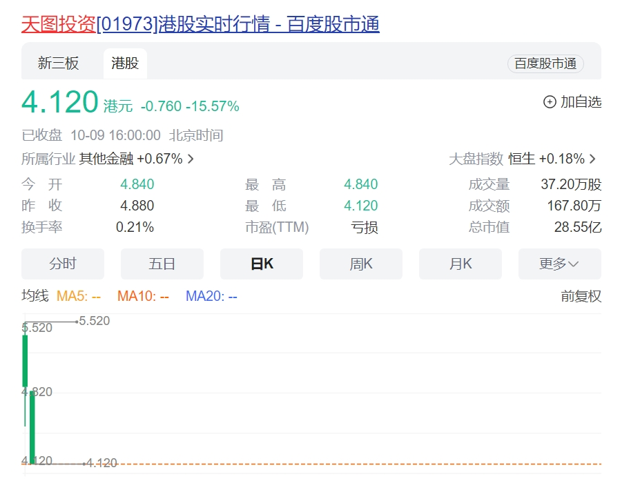 天图投资股价开盘下跌17.08%,从6.5港元跌至5.3港元,并一路下探4.49港元。随后经历V型反弹至开盘价附近,最高达5.52港元。紧接着再次下跌,并以每股4.88港元的股价收盘。当日跌幅24.92%。
