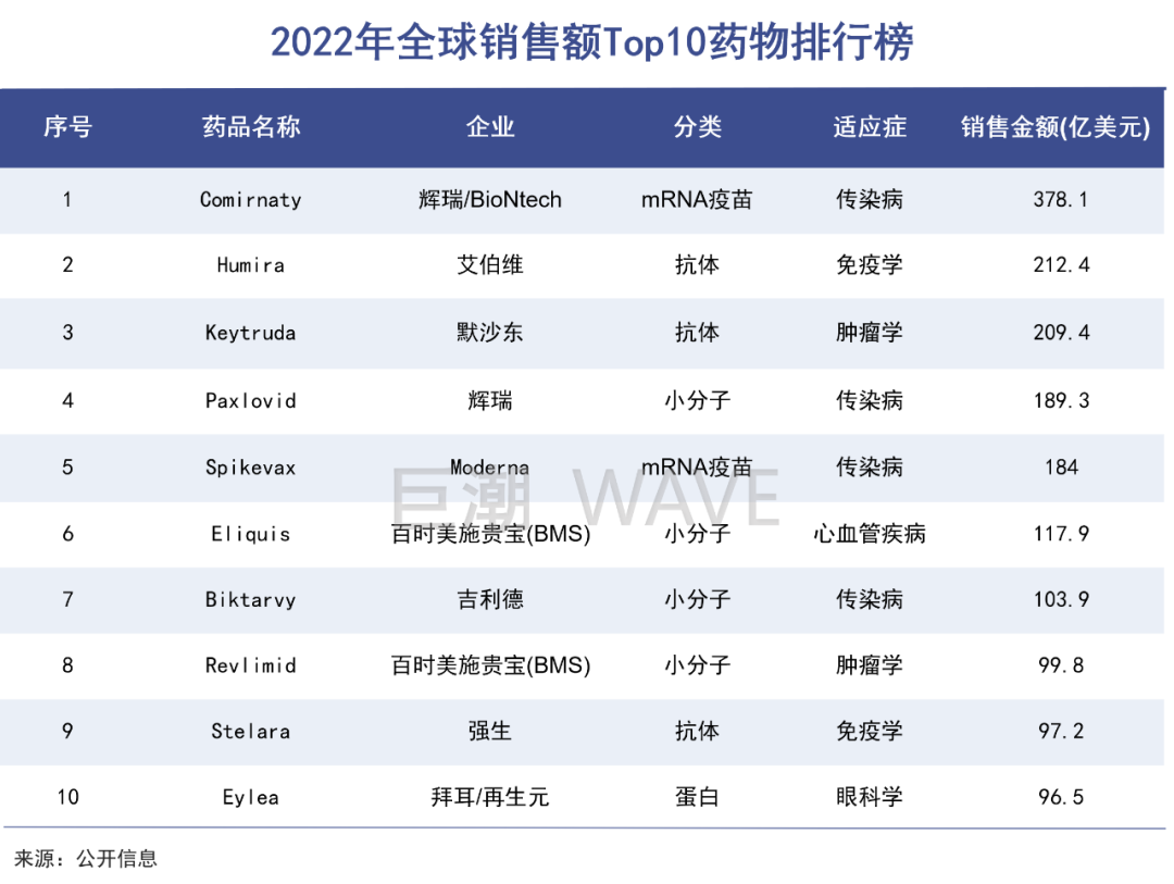 这也并不是Comirnaty第一次发威。2021年,Comirnaty就已经录得368亿美元收入,成为人类历史上第一个销售额突破“两百亿”美元的药品。这个数字也让Comirnaty成功登顶2021年最畅销的药物,没有之一。