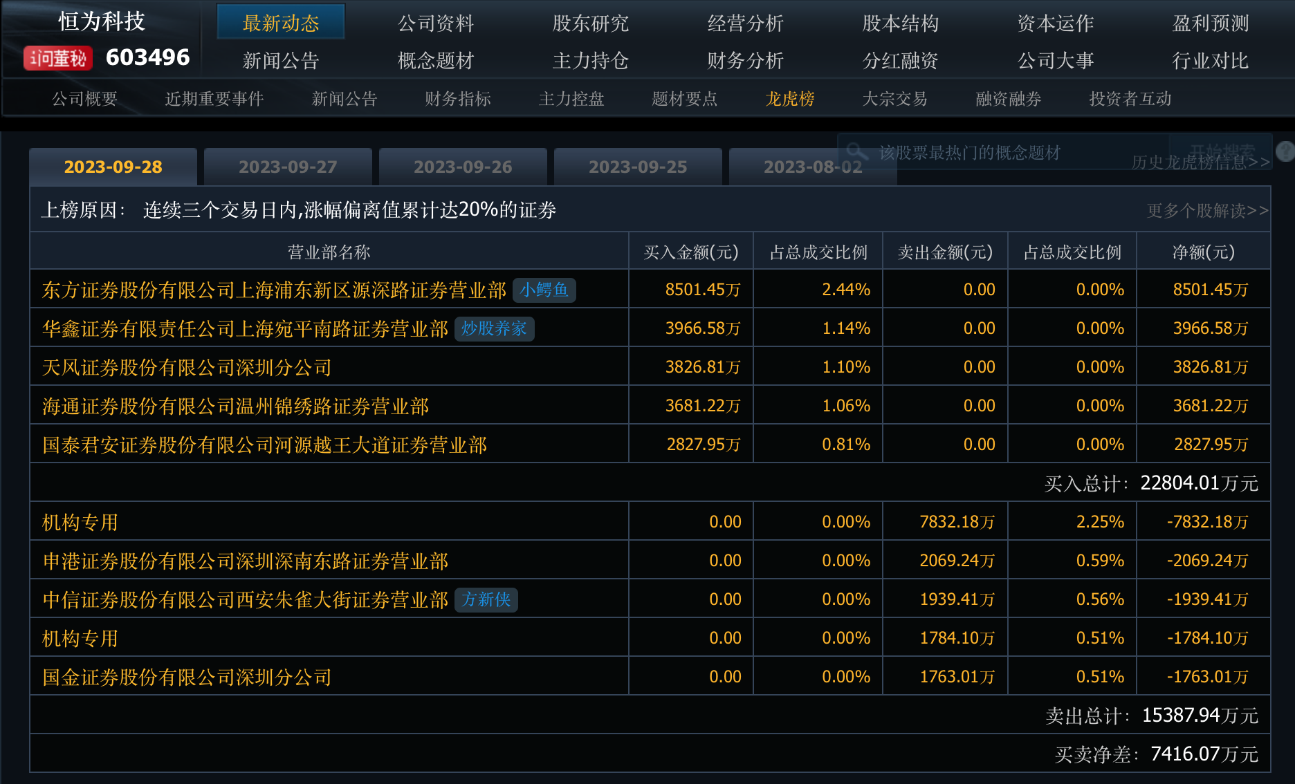 盘面显示,恒为科技是从9月20日开始上涨,而后一发不可收拾,9月20日至10月9日共计8个交易日累计涨幅达78.84%,累计换手率76.73%。尤其是近6个交易日有5个涨停板,行情贯穿双节。