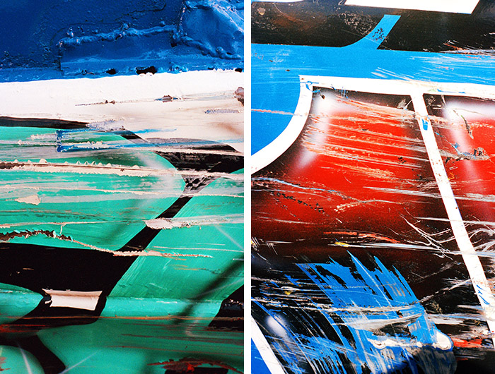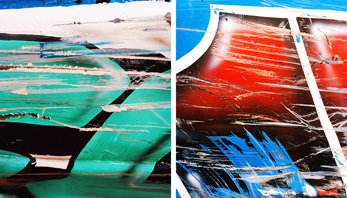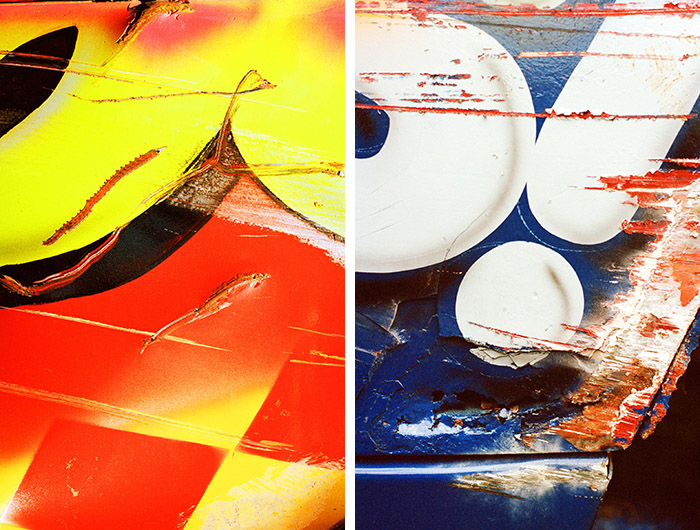 Green跟进了英国境内大大小小的各项撞车大赛,拍下了不少照片,最后甚至还做成了纪录片《Bangers & Smash》。拍照时她会直接走到赛道里,或是乘车手们于比赛间隙重新启动车子时去维修区逛逛。她的拍照工具是一架尼康FM,而她的关注点主要是那些被油漆覆盖住的大大小小的刮痕和凹陷。“我一般会说:‘哇噢,这道擦痕真好看,’”她说,“而车手则通常一头雾水,回道:‘啊?’”