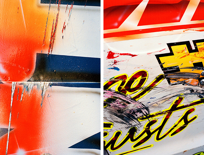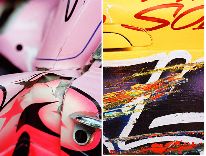 Green两年前在伦敦发现了这项运动,当时她正在骑自行车,路过温布尔顿体育馆时,她听到了从里面传来的巨大引擎声。进入体育馆后,她看到了一群穿着沾满油渍的赛车服的车手,以及一堆在赛道上追逐彼此的赛车。每一辆车的车身上都涂满了各种颜色的油漆,其中有些还刷上了自己的外号,或是写给女友的短信,但比赛开始后,很快这些车子就会变得遍体鳞伤。“我迷上了这些擦伤和划痕的纹理,”她说。