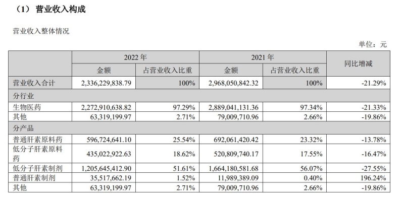 2021年和2022年,常山药业的主要营业收入来自低分子肝素制剂、普通肝素原料药、低分子肝素原料药和普通肝素制剂,所占比例合计分别为97.34%和97.29%,其中低分子肝素制剂收入占比超过一半。