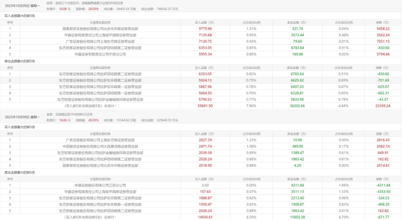 10月9日,常山药业以“连续三个交易日内,涨幅偏离值累计达到30%的证券”和“日涨幅达到15%的前5只证券”再次登上龙虎榜。常山药业股票在近三个交易日内合计成交5.44亿股,成交额超74.85亿元,买入前五名与卖出前五名总合计净买入2.34亿元,其中,国泰君安北京光华路营业部净买入9458.22万元居首,广发证券上海东方路营业部净买入7051.15万元居于其次。