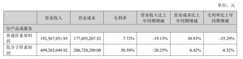 2023年上半年,常山药业的普通肝素原料药和低分子肝素制剂的业务收入分别为1.93亿元和4.99亿元,合计占上半年营业收入8.20亿元的84.32%。在近年财报中,常山药业并未将肝素原料药、肝素制剂之外的其他产品披露为重要收入产品。