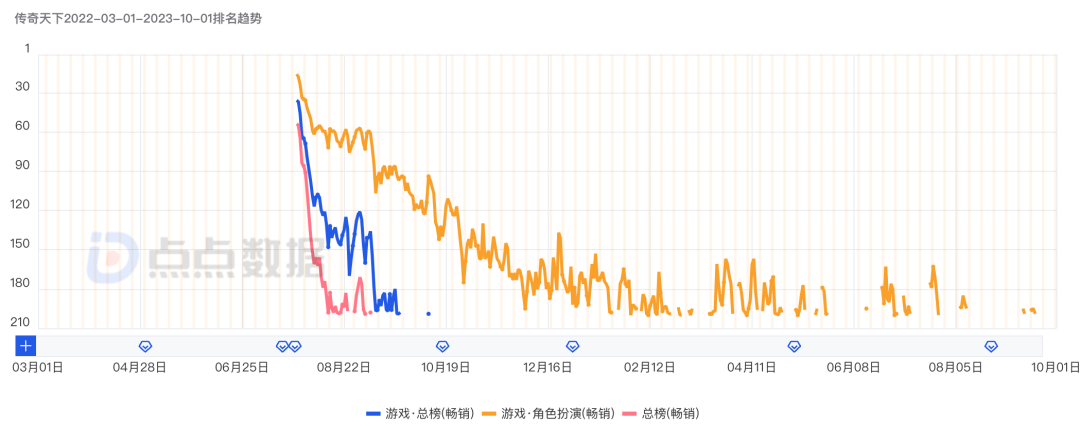 事实上,传奇获量,这些年经历过效果型视频营销、效果型直播、品牌内容/品效合一、私域KOC等等多种尝试。2022年Q2出现了传奇抖音直播热潮。同年Q3在产品方面还出现了正版UE4手游《传奇天下》。很遗憾,根据点点数据,该游戏不到2个月时间,就跌出了iOS畅销榜(总榜)200,在iOS角色扮演畅销榜的子分类,也是持续下滑。