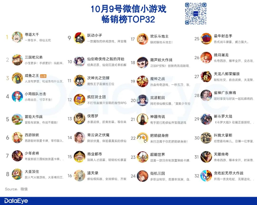 近来,小游戏卷IP的趋势,较为明显。以10月9号微信小游戏畅销榜为例,《青云诀之伏魔》(青时)、《仙剑奇侠传之新的开始》(恺英)、《葫芦娃大作战》(大梦龙途)、《天龙八部荣耀版》、《新斗罗大陆》、《梦幻西游网页版》(网易)都在60名以内。