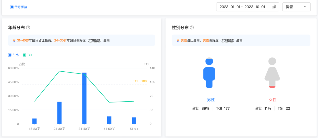 巨量算数显示,今年来前10个月,“传奇手游”关键词的关联受众,在抖音上31-40岁占55.1%,男性占89%;在今日头条上,31-40岁占47.7%,男性占80%。
