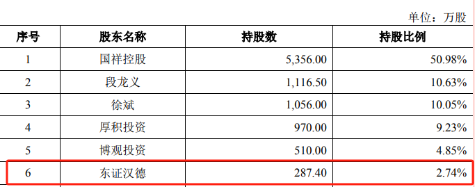 除此之外,东方证券全资子公司持股企业东证汉德持有浙江国祥发行前2.74%股权,且东方证券与浙江国祥控股股东国祥控股关系匪浅,存在合伙持有其它公司股权的情形。