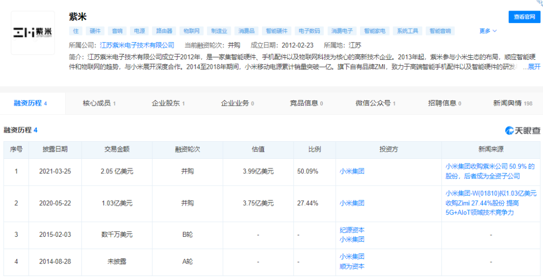 2012年张峰成立江苏紫米电子技术有限公司,次年成为小米生态链企业,负责研发生产小米移动电源及相关配件。2014年到2015年,小米均参与到紫米的A轮和B轮融资中。2021年小米收购紫米50.9%的股份,紫米成为小米的全资子公司,张峰也加入小米。