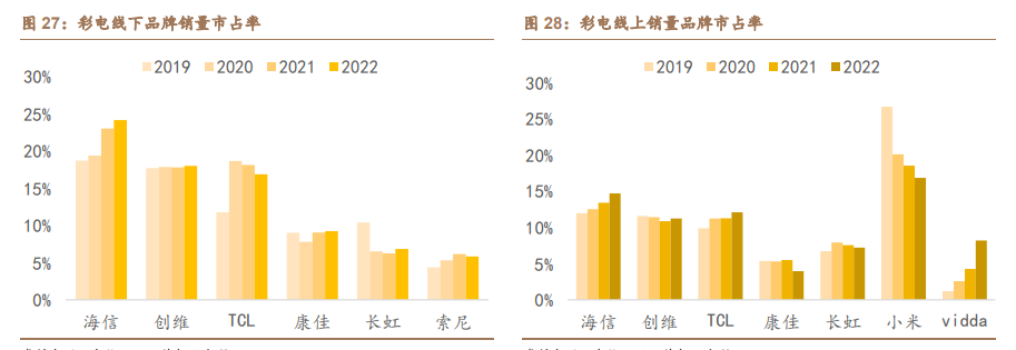 另外曾在线上渠道占据优势的小米电视,自2019年至今,线上市场份额持续下滑。同时考虑到当下各大电商平台流量红利的退潮、推广成本的上涨,目前不少品牌均在纷纷追求线上和线下的高度融合。但问题是,国内电视线下渠道几乎掌握在海信、创维、TCL等传统厂商手中。